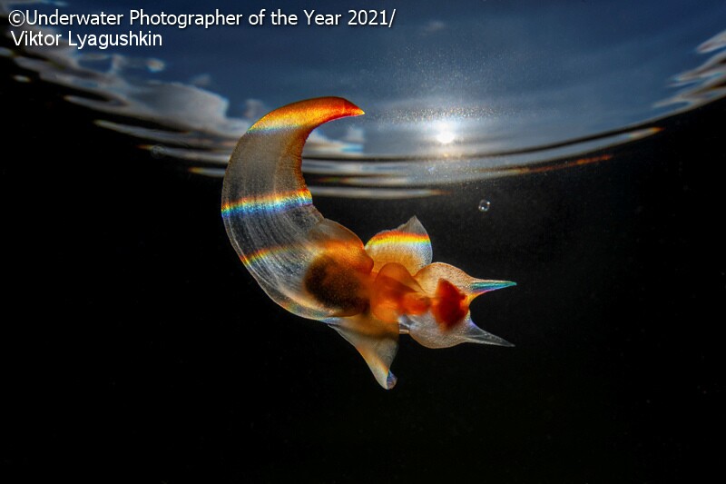 На снимке русского фотографа морской ангел плавает у поверхности воды. Лучи заходящего солнца, преломляющиеся в волнах, раскрашивают полупрозрачное тело моллюска в разнообразные цвета спектра.