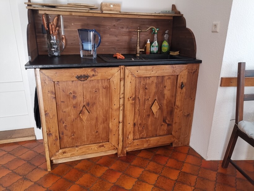 Замок пара привела в порядок, вся мебель была сделана их руками. В первую очередь Юлия взялась за кухню: все шкафы были самостоятельно собраны из дерева. Воды в замке не было, раковина сначала вообще выполняла больше декоративную функцию, пока не установили насос.