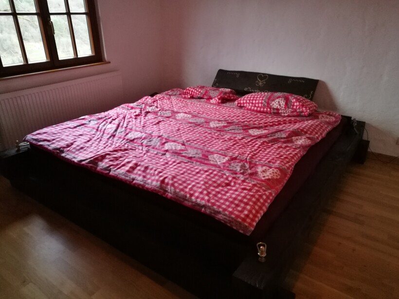 Еще одна гордость временной хозяйки ― это большая двуспальная кровать. Она была сделана собственноручно из дерева, и весит примерно 400 килограммов. Примерно на таких спали столетия назад.