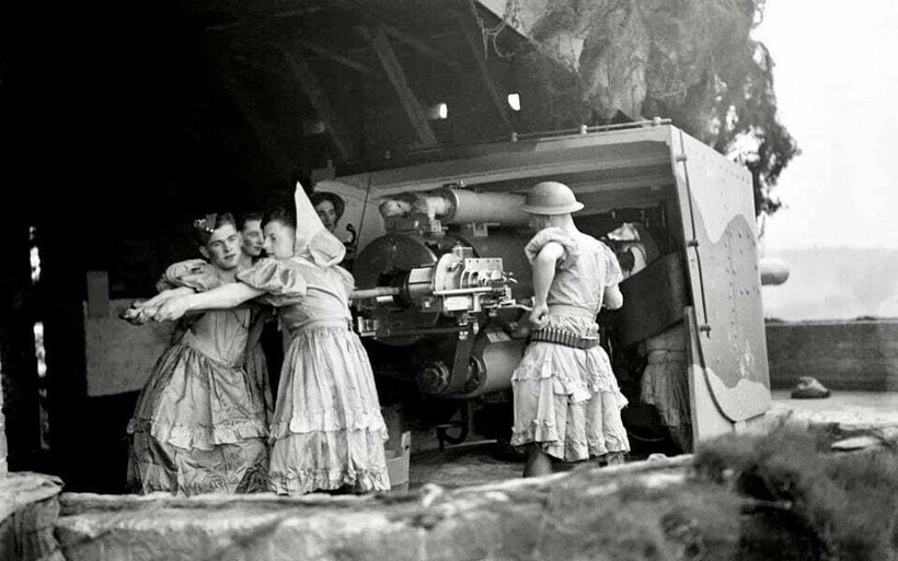 Репетиция шоу британских служащих была остановлена из-за внезапной воздушной атаки, поэтому актеры готовятся к бою прямо в костюмах.