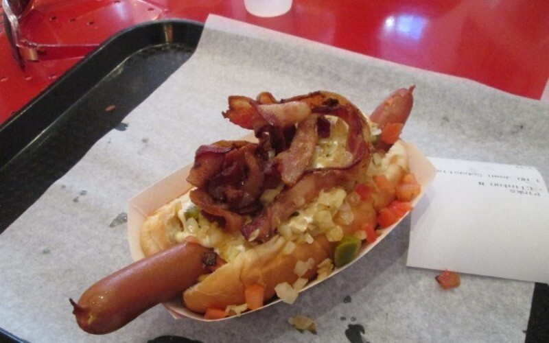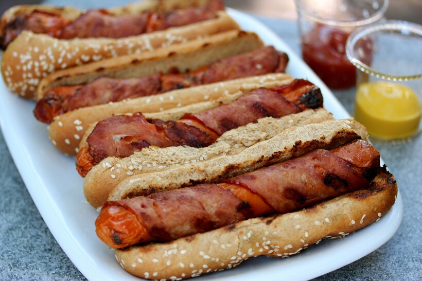 Еще один калорийный взрыв в нашей подборке. Да, это блюдо действительно состоит из сосиски с беконом, помещенных в булку.