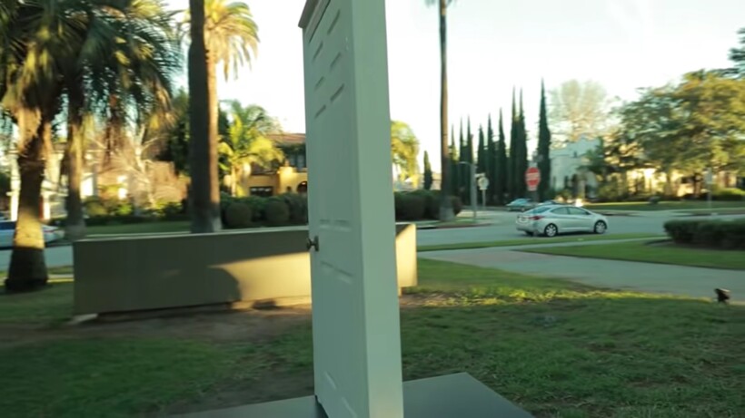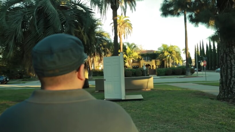 Мужчина заходит в дверь, стоящую посреди парка, и бесследно исчезает.