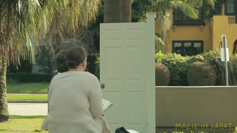 Мужчина установил дверь посреди парка. Он выбрал такой ракурс, чтобы стоящая рядом скамейка была перпендикулярна к двери. Сидящие на ней люди видят дверь в никуда ровно сбоку. Фокусник подходит к двери, открывает ее, перекрывая обзор людям, и по прямой траектории двигается за небольшое препятствие за дверью. Когда дверь захлопывается, люди видят перед собой пустое место, и у них создается впечатление, будто мужчина загадочным образом исчез.