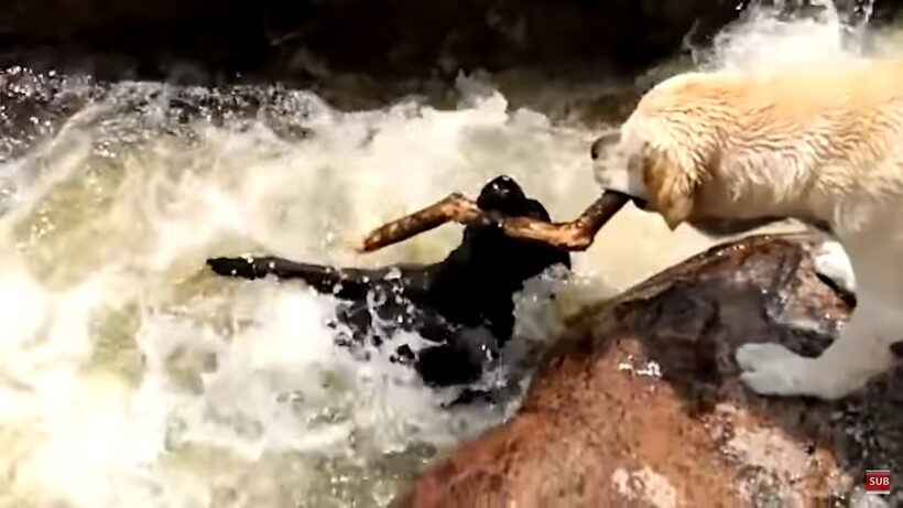 Невероятное спасение произошло в горах возле водопада. Черная собака увидела в воде палку и решила за ней спуститься. Схватив ее, она уже направлялась в сторону берега, но сильное течение увлекло ее к водопаду. К счастью, рядом оказалась другая собака, которая стояла на краю берега и успела схватить палку в зубах черного пса. Потянув на себя, она выдернула пса из бурного водоема и спасла жизнь любопытному четвероногому. До сих пор непонятно, чем привлекла пса деревянная коряга, ведь если бы он не полез в воду, мог бы избежать этой опасной ситуации. Хотя, стоит отметить, что благодаря той же самой палке собака и осталась жива.