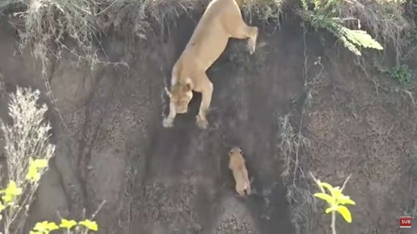 Один из фотографов запечатлел трогательное видео спасения львенка, который сорвался с обрыва и чудом зацепился лапками за земляной грунт. Мама-львица понимала, что ситуация серьезная, и они оба могут упасть. Она начала медленно спускаться к малышу, цепляясь когтями за почву. Львица успела схватить детеныша, прежде чем он упал с обрыва, и оба животных остались живы. Когда они благополучно спустились, им двоим предстоял еще один путь — обратно наверх.