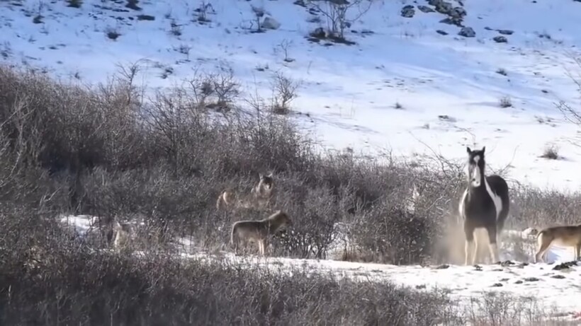 Лошадь в свою очередь, кажется, совсем не боялась диких хищников и даже ложилась на землю перед ними. Фотограф был удивлен и уже подумал, что хищники вот-вот нападут на нее. Ведь этот поступок мог послужить идеальным моментом для атаки серых хищников. Но этого не случилось: они просто с любопытством смотрели, как лошадь нежится в снегу.
