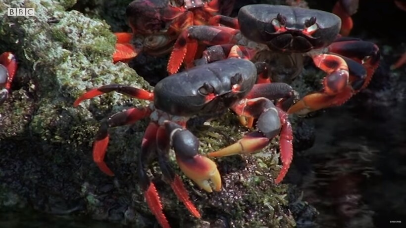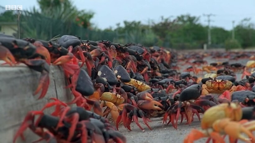 «Они направляются к Карибскому морю с одной целью — им нужна вода, хотя они являются сухопутными крабами. Но именно в воде происходит появление новой жизни. Каждая самка краба несет с собой несколько тысяч крошечных яиц, и стоит ей опуститься под воду и высвободить их, как из яиц вылупляются маленькие личинки. Примерно через месяц они снова вылезут на берег и начнут свою жизнь как сухопутные крабы», — заканчивается рассказ.