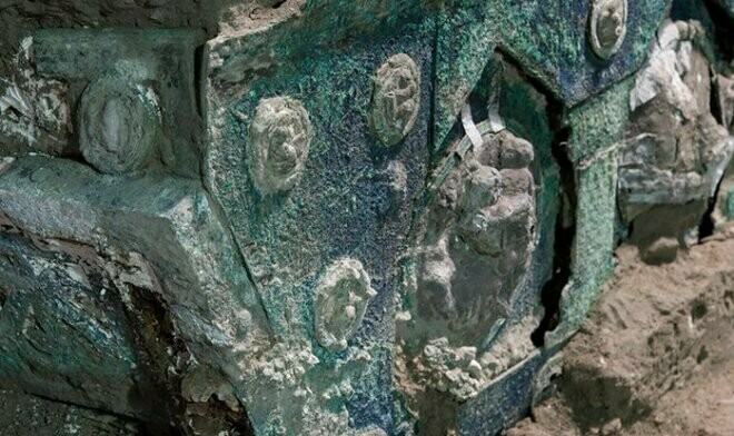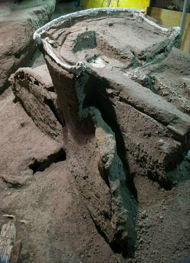 Как полагают ученые, колесница была шикарно украшенной для своего времени. Оловянные и бронзовые украшения, цветочный декор, а также множество изображений богов, в том числе Эроса. Обнаружить колесницу удалось в пригородной вилле Чивита Джулиана, находящейся неподалеку от Помпей, и сегодня со всей осторожностью археологи пытаются извлечь ее. Все девятнадцать веков повозка находилась под слоем пепла, что и позволило ей так хорошо сохраниться.