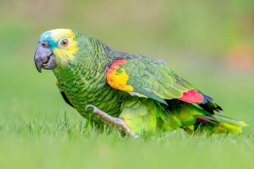 Самые крупные и яркие попугаи родом из Южной Америки, где жарко и влажно, а потому много пышной растительности, где попугаи могут находить насекомых, семена и плоды. Один из таких представителей — синелобый амазон. Он выделяется красивым зеленым оперением и голубым пятном на голове. Кроме того, он считается одним из самых умных говорящих попугаев. Но чтобы научить его словам и выражениям, потребуется немало времени.