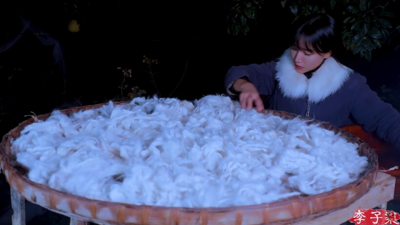 В отдаленных китайских провинциях бартер имеет силу как в древности — одни вещи можно выменять на другие. Так и наша героиня поменяла ткань и фрукты на овечью шерсть у пастуха. Овец нужно стричь каждый год, чтобы им было легче летом и они могли нарастить новую шерсть к зиме. Состриженную шерсть сперва очищают от сора, а затем замачивают в горячей воде. Добавив моющего средства, нужно как следует простирать шерсть, а затем положить ее сушиться.