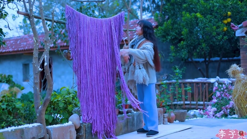 Чистую сухую шерсть вычесывают и сваливают так, чтобы получались длинные вытянутые куски. Дальше в ход пойдет прялка, при помощи которой заготовленные куски шерсти вытягиваются в плотные нити, а затем формируются в мотки. Шерсть можно оставить чисто-белой, но наша героиня захотела окрасить ее в яркий фиолетовый цвет. Для этого она использовала сок ягод, чтобы даже краситель был натуральным. Мотки шерсти окунались в кипящий сок черники, а затем в раствор соли и соды, который действует как закрепитель цвета. Развесив нити на веревку, девушка просушила их, а на следующее утро начала вязать.