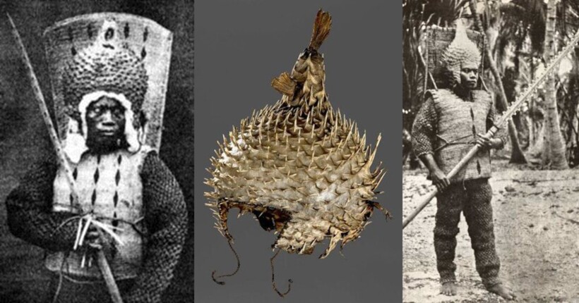 Не все в мире могли делать железные доспехи, и тогда в ход шли любые подручные средства. К примеру, туземцы тихоокеанских островов использовали для создания защитной одежды кости рыб, волокна кокоса и даже собственные волосы. Чтобы сделать эффектный шлем, покрытый острыми шипами, островитяне ловили рыбу-ежа, сушили ее в песке, а потом натягивали на половинку кокоса. Конечно, от топора или копья такой шлем не спасал, но мог наверняка защитить от ударов палки или зубов акулы. Чтобы тело тоже было не таким беззащитным, туземцы плели прочную одежду из кокосовых волокон или сшивали кожу скатов своими волосами. Волосы человека — это довольно прочный материал, который можно использовать с умом.