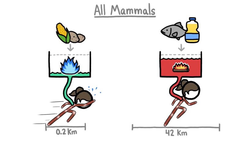Все млекопитающие получают энергию от пищи в два этапа. На первом этапе гликоген превращается в энергию, а на втором — в жиры и белки. У всех животных последовательность этих двух этапов не нарушается. Гликоген дает всплеск энергии, которая быстро иссякает, а белки и жиры могут долгое время подпитывать организм животного силами. Главная особенность помеси хаски и маламута заключается в том, что они умеют сразу переходит ко второму этапу расходования энергии.