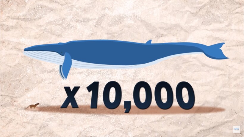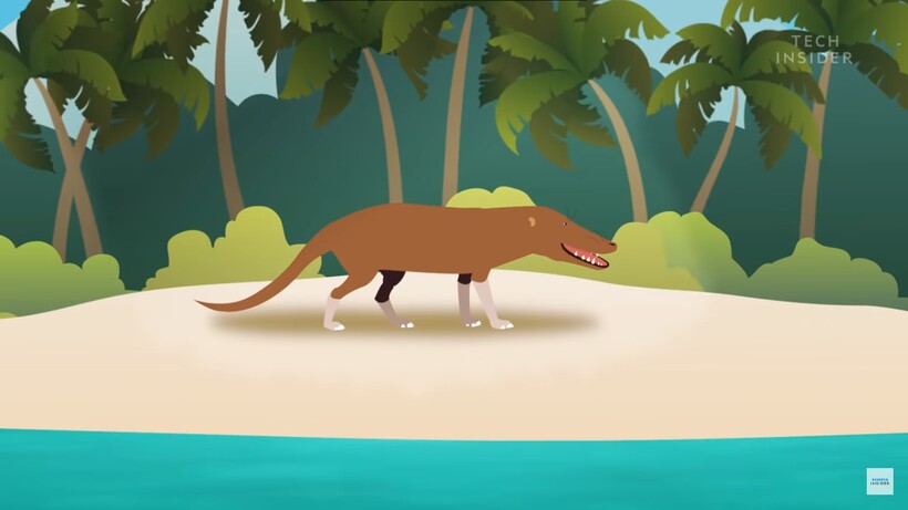 «Киты — самые большие животные всех времен. Они тяжелее слонов, шерстистых мамонтов и даже динозавров. Но они не всегда были морскими титанами. Давайте перемотаем часы на 50 миллионов лет назад. Тогда в океане вы бы не нашли китов — для этого нужно выйти на берег и познакомиться с пакицетом, самым первым китом в мире.