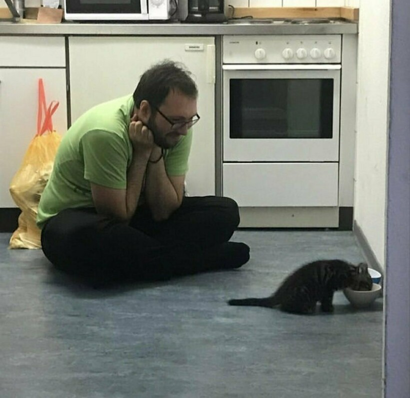 Осторожно, ведь умиление от этого снимка может начать зашкаливать. Больше всего захватывает выражение лица мужчины, которое передает невероятное счастье от того, что его маленький друг просто себе кушает. Разве можно после такого сомневаться в человеческой доброте?