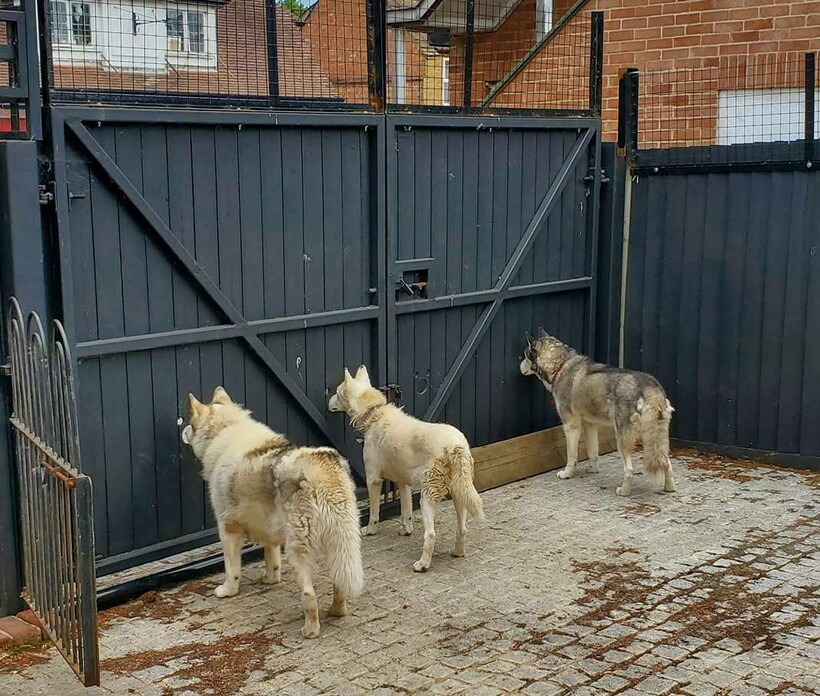 Тогда Граннелл придумал хитрость, чтобы удовлетворить любопытство своих питомцев: он просверлил дырки на уровне собачьих глаз и носа. И вот теперь несколько раз в день его хаски занимают свои смотровые посты, чтобы понаблюдать за происходящим.