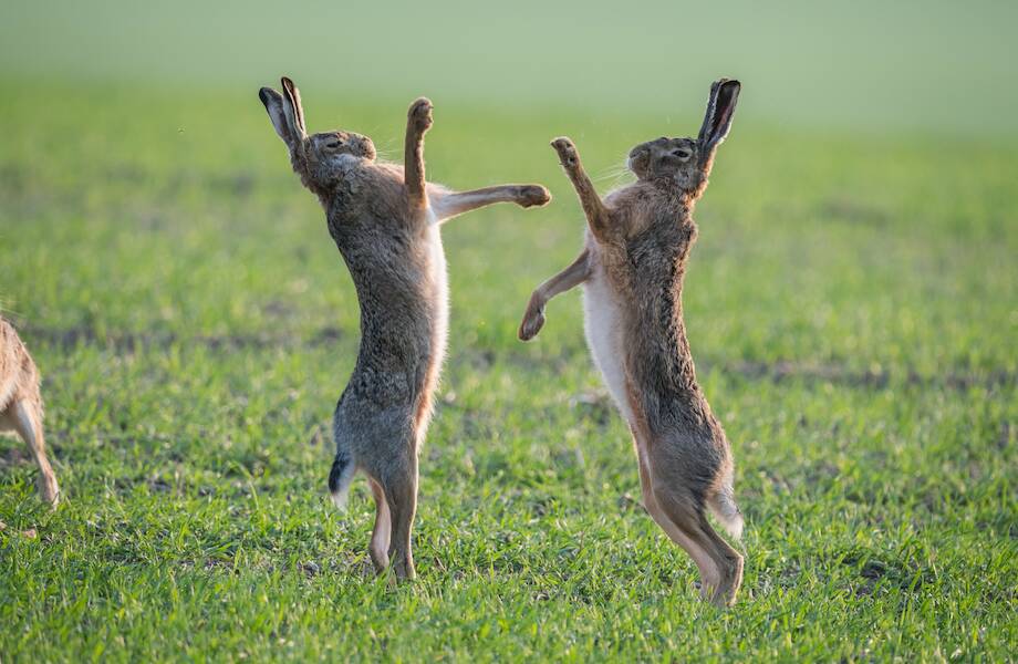 За каждую самку обычно сражаются 2-3 претендента. Именно они соперничают друг с другом, проверяя на скорость и силу, ведь только сильный и ушлый русак достоин продолжать род. Однако проигравшим не стоит огорчаться — брачный сезон у зайцев не один раз в год, и уже через пару месяцев самка даст потомство, а еще через два месяца самцы вновь могут попробовать завоевать ее сердце. Кстати, зайцы далеко не самые безобидные звери и при случае могут дать отпор обидчику.