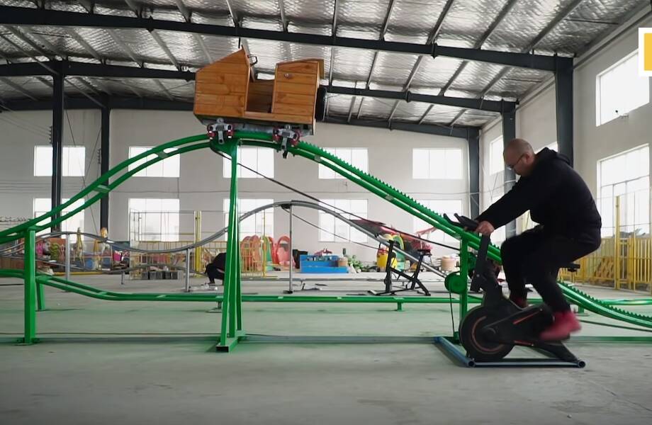Вэй считает, что фитнес и развлечения могут идти рука об руку, а кроме того, совместить занятия спортом и веселье с детьми. По своей специальности Жоюй мастерит оборудование для детских площадок, и он решил использовать свой опыт для чего-то нового. Что же нового в американских горках? Дело в том, что Вэй совместил велотренажер, рельсы и деревянную тележку, а аттракцион полностью на человеческой тяге — он работает до тех пор, пока взрослый крутит педали тренажера.