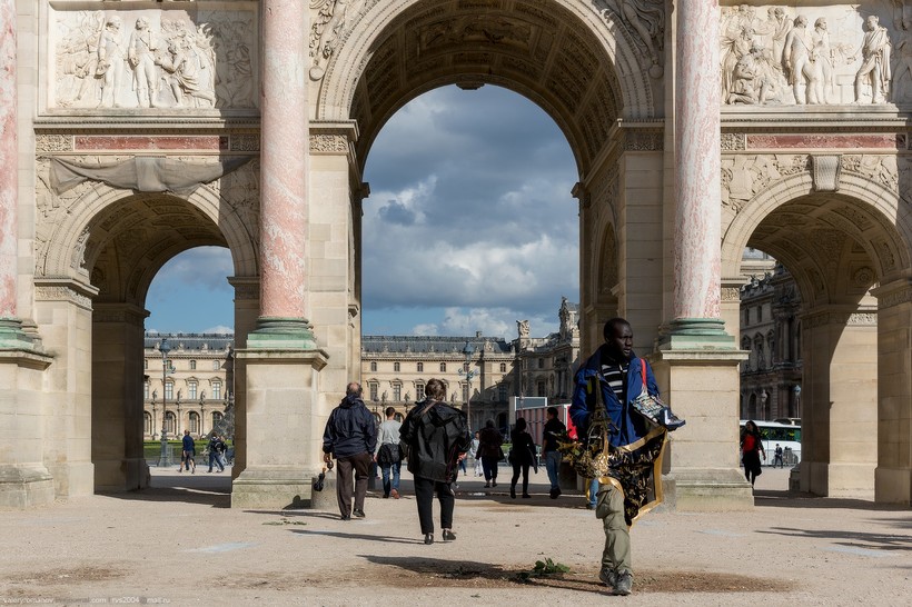 Нелегал на фоне барельефов Малой Триумфальной Арки и Лувра