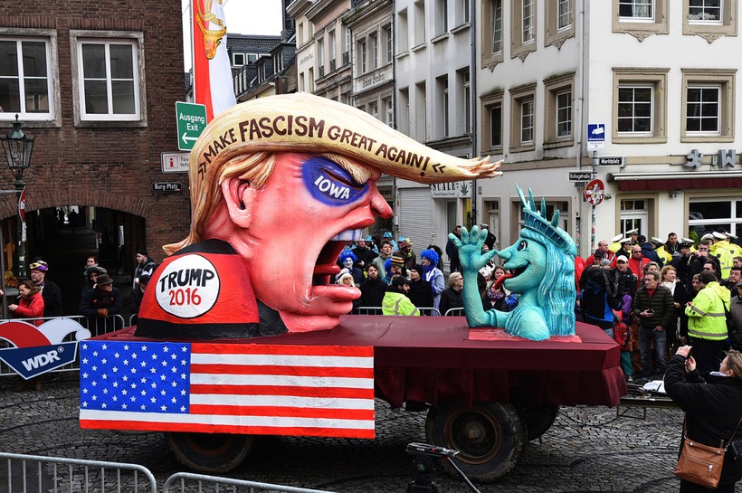 В германском городе Дюссельдорф в параде участвовала платформа, на которой изображен агитирующий за фашизм Дональд Трамп и Статуя Свободы как символ прав людей.