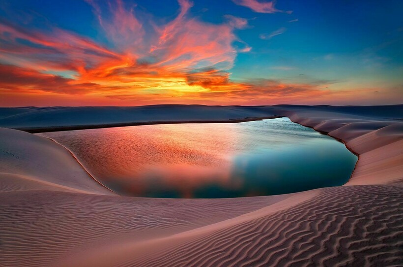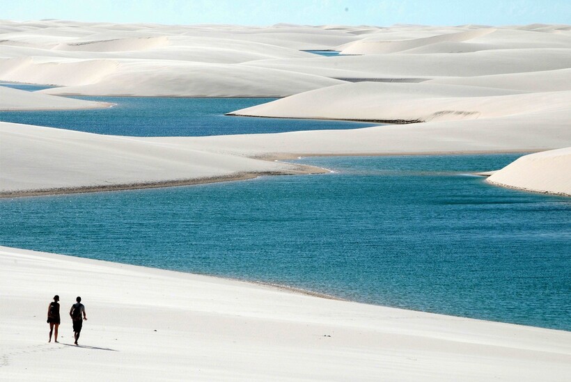 Ленсойс-Мараньенсис — это национальный парк Бразилии, красота и уникальность которого защищается законами страны. С высоты птичьего полета видны многочисленные песчаные косы и барханы, которые разделены зеленоватыми водными островками. Поначалу и барханы и озера кажутся совсем небольшими и неглубокими, но на самом деле высота песчаных дюн доходит до 40 метров, а озера настолько большие, что там можно кататься на водных лыжах. Но как же возможно, чтобы в пустыне были озера?