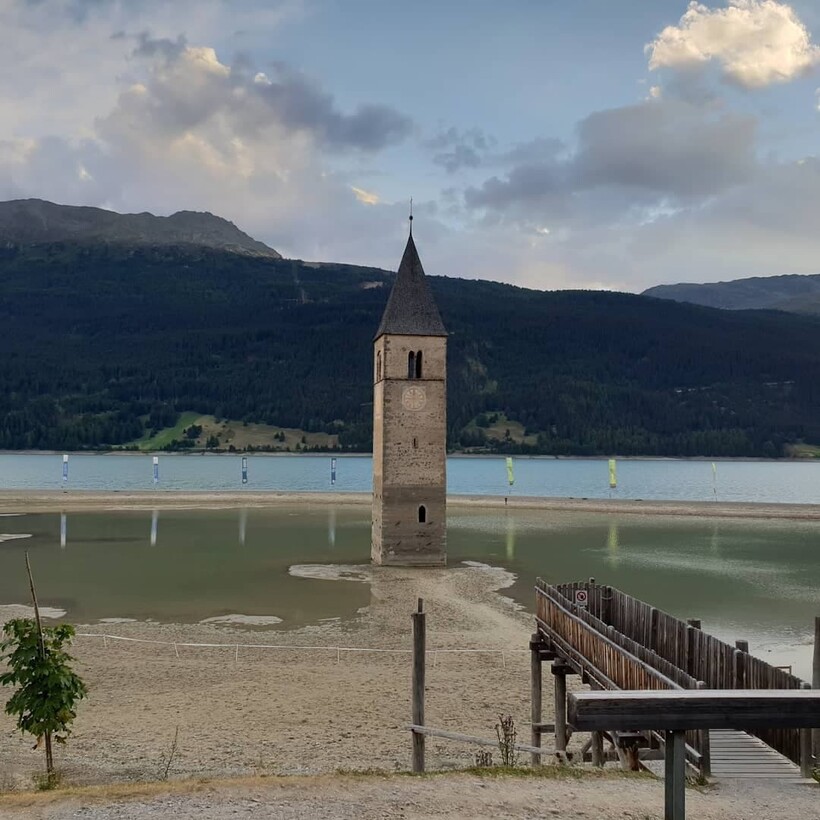 Резия ― искусственное озеро, которое появилось в середине прошлого века во время строительства ГЭС. Тогда на дне водоема оказались несколько деревень, в том числе и деревня Курон с церковью XIV века.