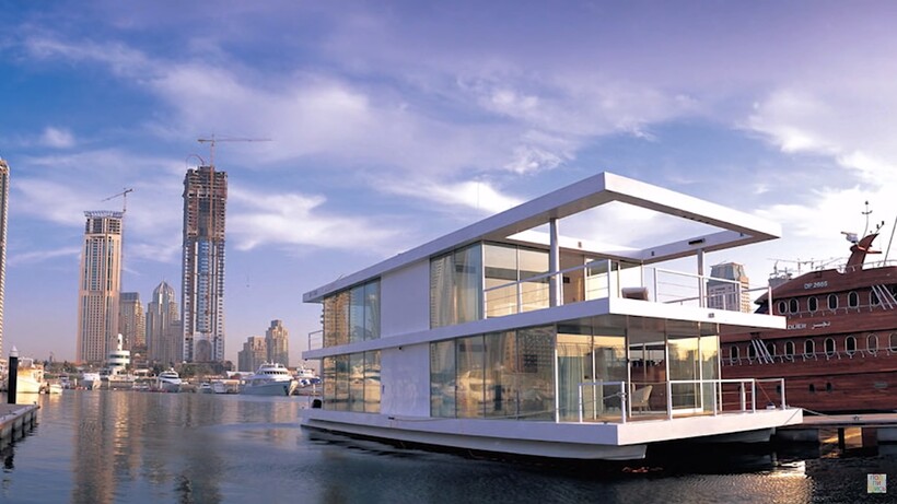 Недвижимость на воде, как правило, не имеет собственного двигателя, который позволил бы перемещать ее в пространстве. Больше всего она похожа на платформу, закрепленную на поверхности воды. Такие дома подключены к электрической сети, снабжены полноценной канализацией и водоснабжением. Один из самых роскошных представителей таких домов — ‘O’ DE SQUISITO. Вилла, которая сочетает в себе морской тип отдыха и потрясающий интерьер в минималистическом стиле. Конструкция выполнена из стекла и нержавеющей стали, а для устойчивости применялись специальные балки. Шикарная современная мебель в сочетании с правильным освещением делает это уютное гнездышко более ярким, когда оно скользит по прозрачным водам ОАЭ.