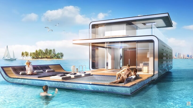 Недвижимость в Дубае всегда привлекала внимание, ведь здесь человек с достатком может приобрести восхитительный дом на воде. «Плавучий морской конек» — невероятный проект трехъярусной виллы с подводной частью дома, в которой находится спальня и ванная комната. Из нее открывается потрясающий вид на подводный мир, в том числе и морских коньков, которых часто можно увидеть в Арабском заливе. Основной этаж на уровне моря занят кухней и гостиной, а также террасой, на которой можно отдохнуть. А на верхней палубе можно полюбоваться прекрасными морскими пейзажами.