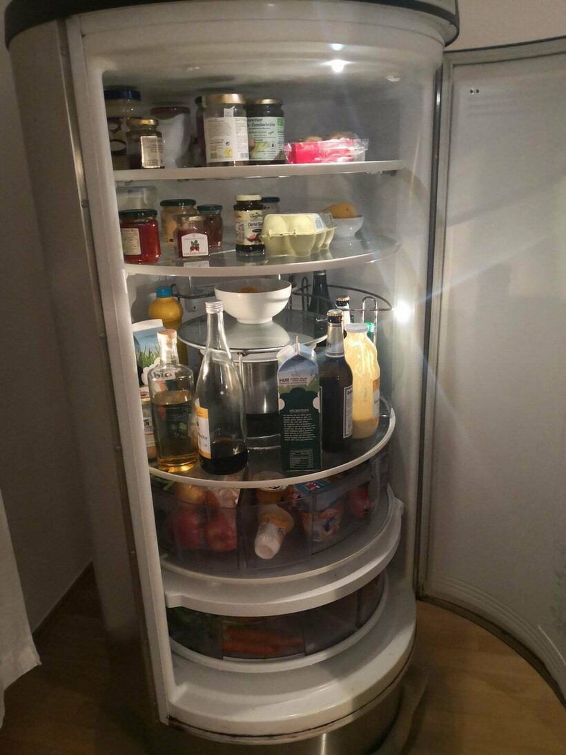 Круглый холодильник с крутящимися полками, который позволит легко достать даже то, что в самом конце