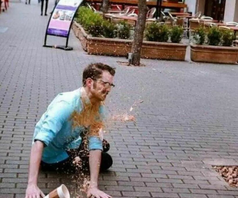 Мужчина совершил неудачную посадку на тротуар, расплескав кофе.