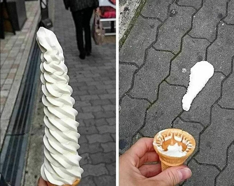 Красивое мороженое не удержалось в рожке и упало на землю.
