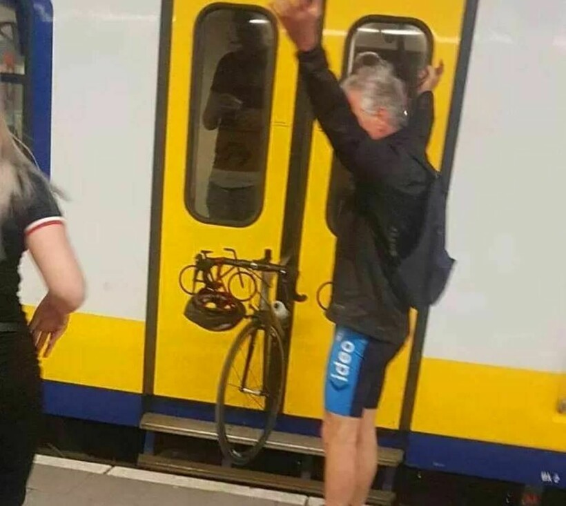 Мужчина прощается со своим велосипедом, который он не успел вытащить вовремя из вагона.