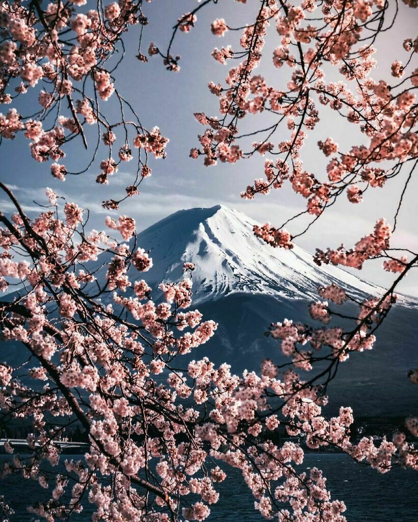 Снимок, на котором собрано все, что нужно знать о Японии: горы и сакура.