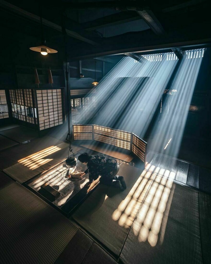 Свет проникает в здание ровными полосами, оставляя на полу теплый отпечаток солнца.