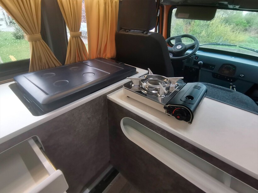 Также внутри машина оборудована небольшой кухней. Тут уместилась раковина с краном, на которой размещается разделочная доска в виде крышки, шкафчики для хранения личных вещей и багажа. Есть здесь и небольшие рабочие поверхности для готовки.