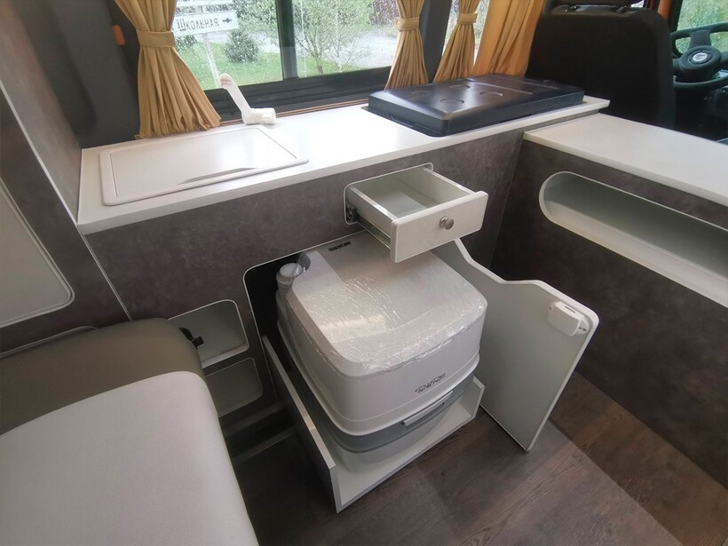 В шкафчики помещаются баки для воды, в общей сложности на 40 литров. Также здесь есть место, куда можно установить биотуалет для транспортировки.