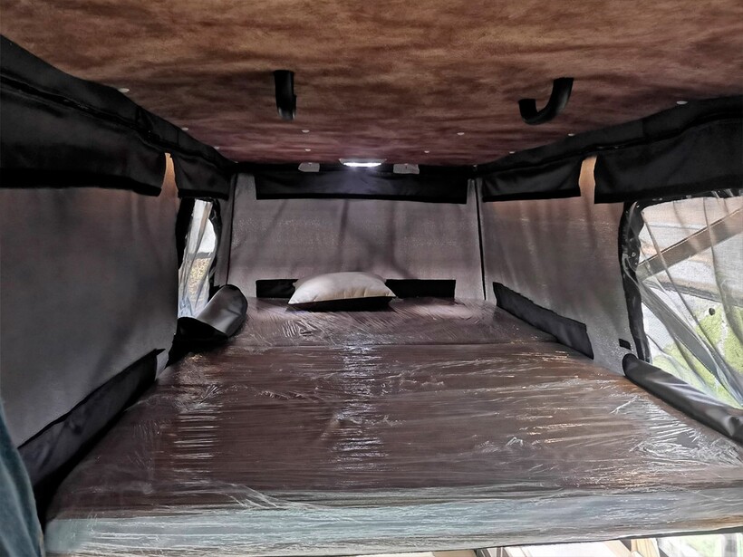 Фактически, это что-то типа палатки прямо на крыше, и вход в нее находится внутри салона. «Палатку» можно опустить, а можно поднять для сна. Есть тут и окно.