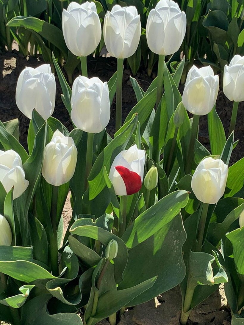 Среди многочисленных белоснежных тюльпанов один имеет красный лепесток
