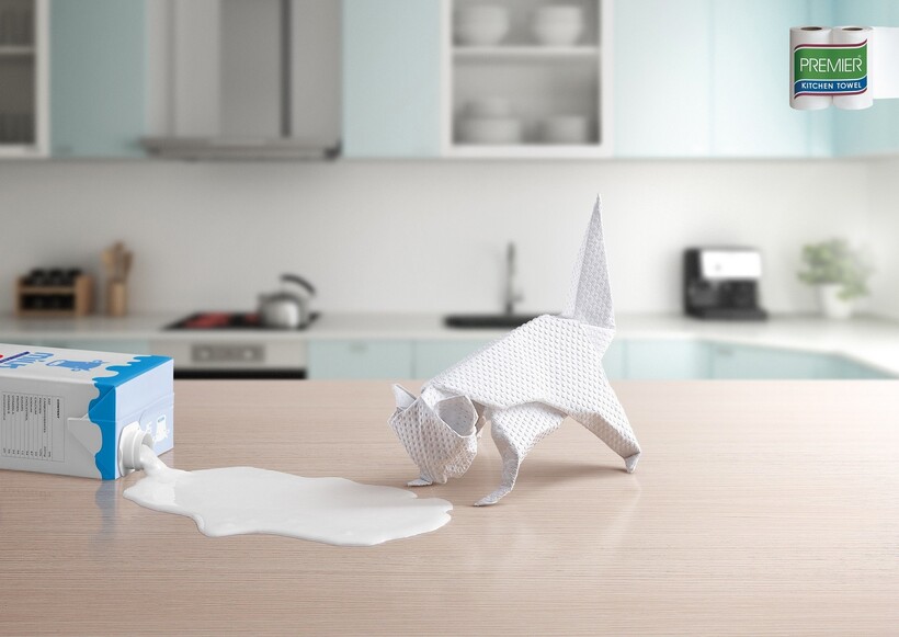 Умилительная реклама основана на впитывающих свойствах полотенец, которые продемонстрированы с помощью образа котенка. Так, пролитое молоко будто бы пьет маленький бумажный котенок, оставляя поверхность чистой.
