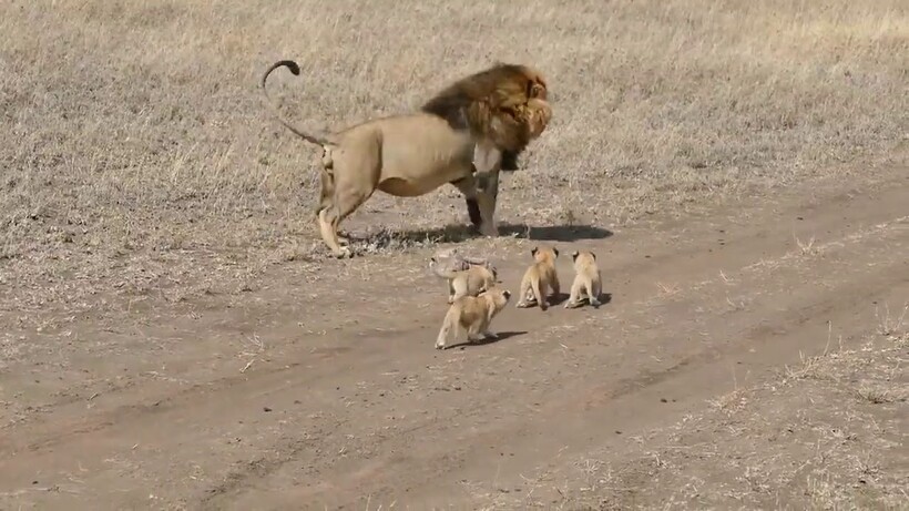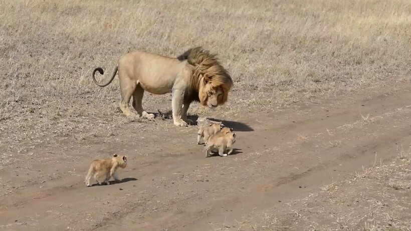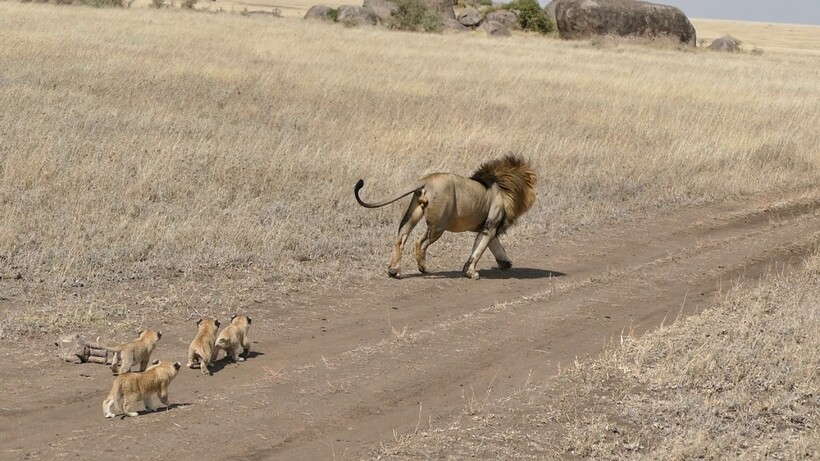 На кадрах можно увидеть царя зверей, за которым следуют четверо маленьких львят. Кажется, лев думал, что дети сами отстанут от него, но не тут-то было! В какой-то момент уставший отец начинает прибавлять темп и переходить на бег, но малыши заметили это и тут же последовали за ним, пытаясь сократить дистанцию. Они точно не хотят отходить далеко от своего отца.
