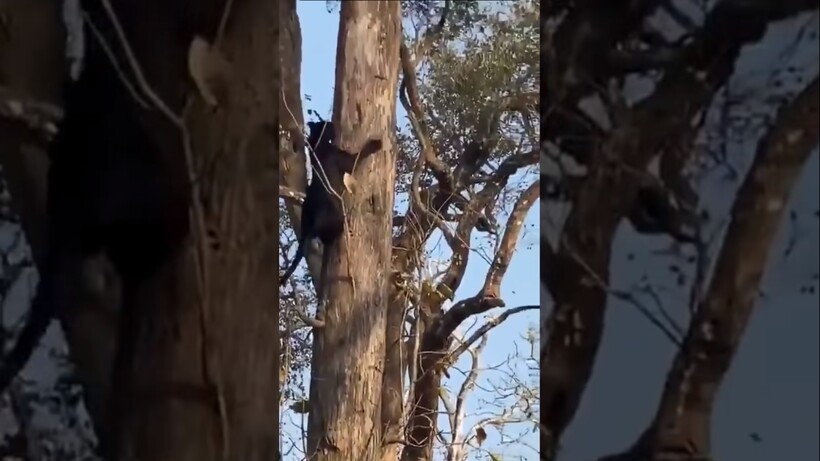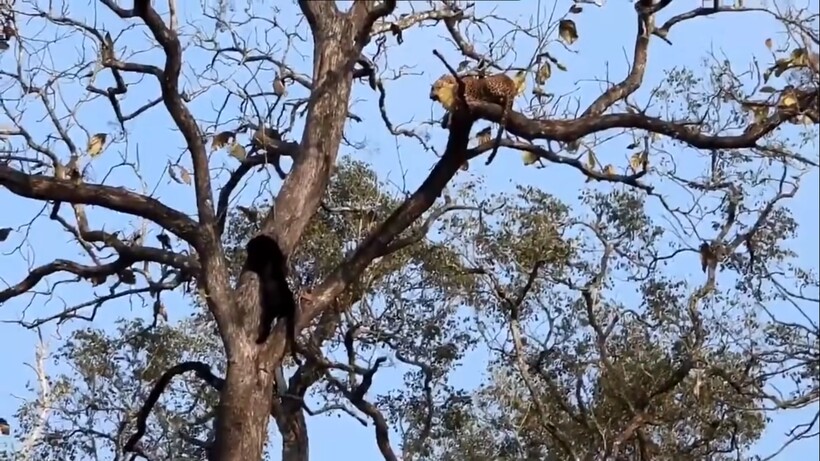 Туристы, прибывшие на экскурсию в заповедник, проезжали мимо одного из деревьев, на котором расположился леопард. Экскурсовод заметил, что животное отдыхает на могучих ветках, и пояснил группе, что когда-то дикая кошка получила серьезную рану на морде, поэтому ее и прозвали Лицо со шрамом. Кстати, гостей хищник тоже не очень-то любит, поэтому группа просто решила немного понаблюдать за ним издалека, чтобы не тревожить пятнистого зверя. Однако черной пантере, прогуливающейся поблизости, тоже захотелось отдохнуть, и она решила вскарабкаться туда, где уже находился леопард.