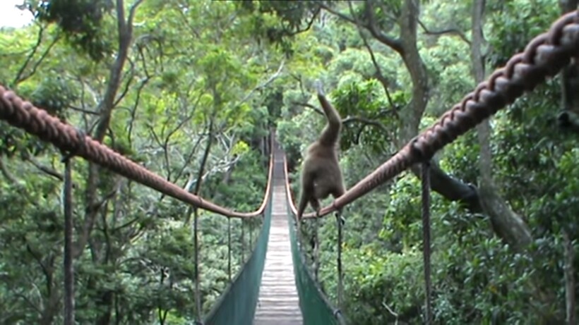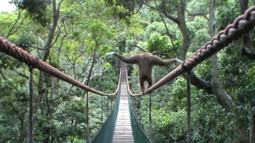 Оказывается, даже в национальных парках и заповедниках случаются сложности. Например, в хайнаньском лесу образовался овраг, преодолеть который приматам было достаточно трудно. Гиббоны придумали способ переправы на другую сторону леса с помощью ветки пальмы, которая впоследствии сильно просела. Чтобы приматы могли попасть из одной части леса в другую, людям пришлось придумать новый способ переправы. И однажды они соединили лес веревками. Получился своеобразный мост, по которому приматы могли передвигаться.