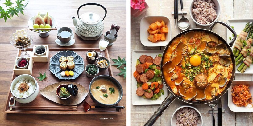 Японцы верят, что если блюдо подано красиво, то оно доставит не только физическое удовольствие, но и эстетическое. Кроме того, в ресторанах предпочитают угощать гостей разнообразными блюдами, но маленькими по объему, чтобы человек ушел с легким чувством голода и хотел вернуться. Китайцы больше ценят домашнюю атмосферу, даже в больших ресторанах: блюда подаются в больших кастрюлях или салатниках, а потом раскладываются всем участниками трапезы по тарелкам. Во многих общепитах кастрюли стоят на маленьком огне, блюдо продолжает нагреваться, когда оно уже накладывается в тарелки.