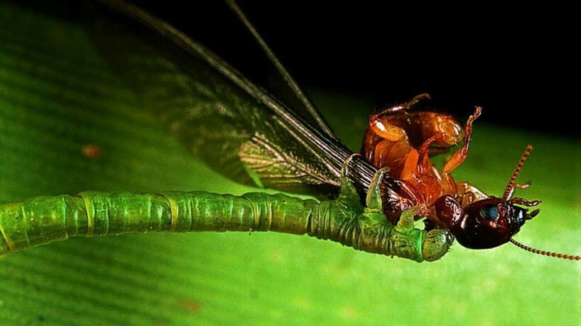 Среди миловидных и медлительных гусениц тоже немало хищных особей. Приспособиться к новому рациону они были вынуждены из-за недостатка растительности. Новоиспеченные хищницы питаются мушками и другими насекомыми, а есть и те, кто предпочитает улиток. Обе разновидности можно встретить на Гавайских островах. Они прекрасно эволюционировали и уже обладают целым арсеналом необходимых приспособлений для удачной охоты. Помимо окраса, практически незаметного среди растений, гусеницы могут изогнуть свое тело в любую нужную им сторону. Уникальные брюшные придатки помогают им укрепиться на поверхности, а когтистые лапки крепко вцепляются в пойманную жертву. К слову, здесь можно увидеть, как охотник-богомол в одиночку справляется с ежом, сколопендрой, змеей и даже котом!