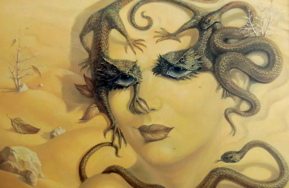 Лицо девушки сложилось на песке из змей, ящериц и листика.
