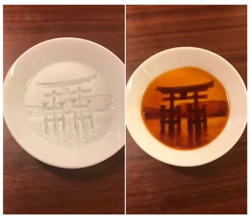 Если налить в тарелку немного соевого соуса, то он попадет в небольшие канавки на дне посуды, образуя очертания ворот храма Ицукусима. Благодаря столь удивительному дизайну есть супы стало еще интереснее.