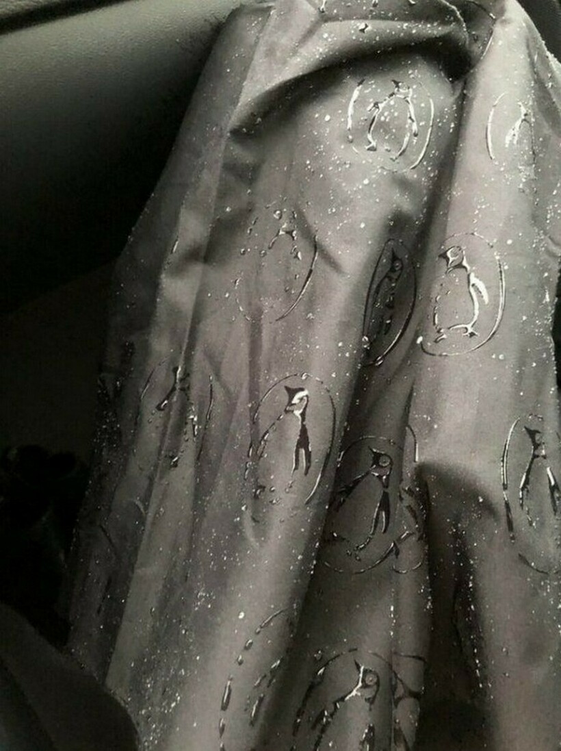 Довольно креативный дизайн зонта заключается в его необычной внешней текстуре. Если с ним попасть под дождь, то наружная его часть намокнет и на ней можно будет наблюдать логотип производителя. Да, на логотипе изображен пингвин.