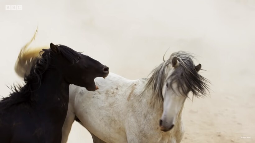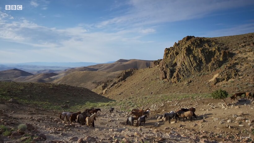 «Сейчас июнь и на западе США в пустынях Невады самое жаркое время года. Группа диких лошадей, мустангов, собирается вместе на одной из последних водяных ям, которая еще не успела пересохнуть. Вода дает лошадям не только возможность утолить жажду, но и восполнить свои силы. Более того, живительная влага помогает проявить себя и изменить свое будущее: если самец сможет контролировать доступ к воде, то он получит право не только управлять стадом, но и спариваться с лучшими самками, чтобы продолжить свой род», — отмечает автор ролика.