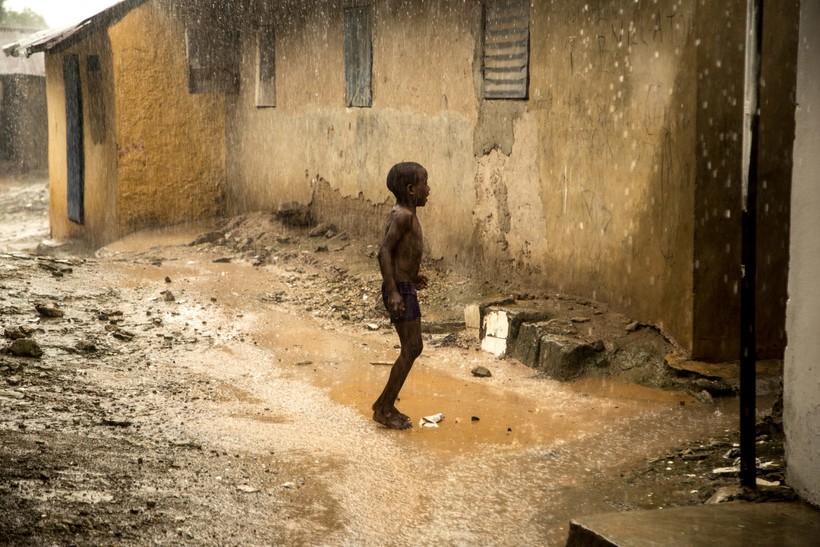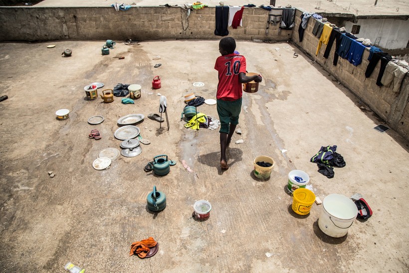 На крыше школы дети стирают одежду, нося воду в ведерках и чайниках.