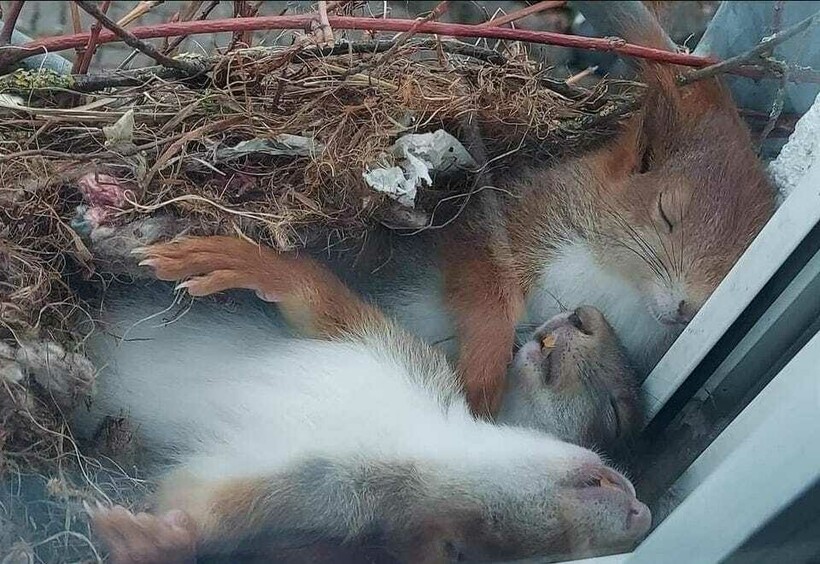 Белки устроили свое гнездо прямо за стеклопакетом